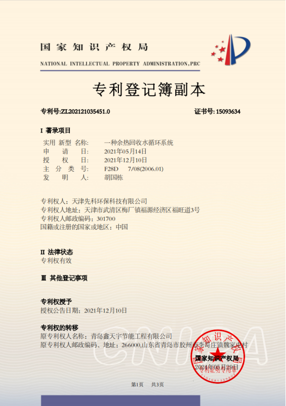 公司拥有自有完全知识产权的专利技术共计5项,在降低炉窑排烟温度、解决低温腐蚀方面,提出了有别于传统设计的方案,目前已经得到了广泛的实际应用,取得了巨大的节能效益,运行业绩较多。